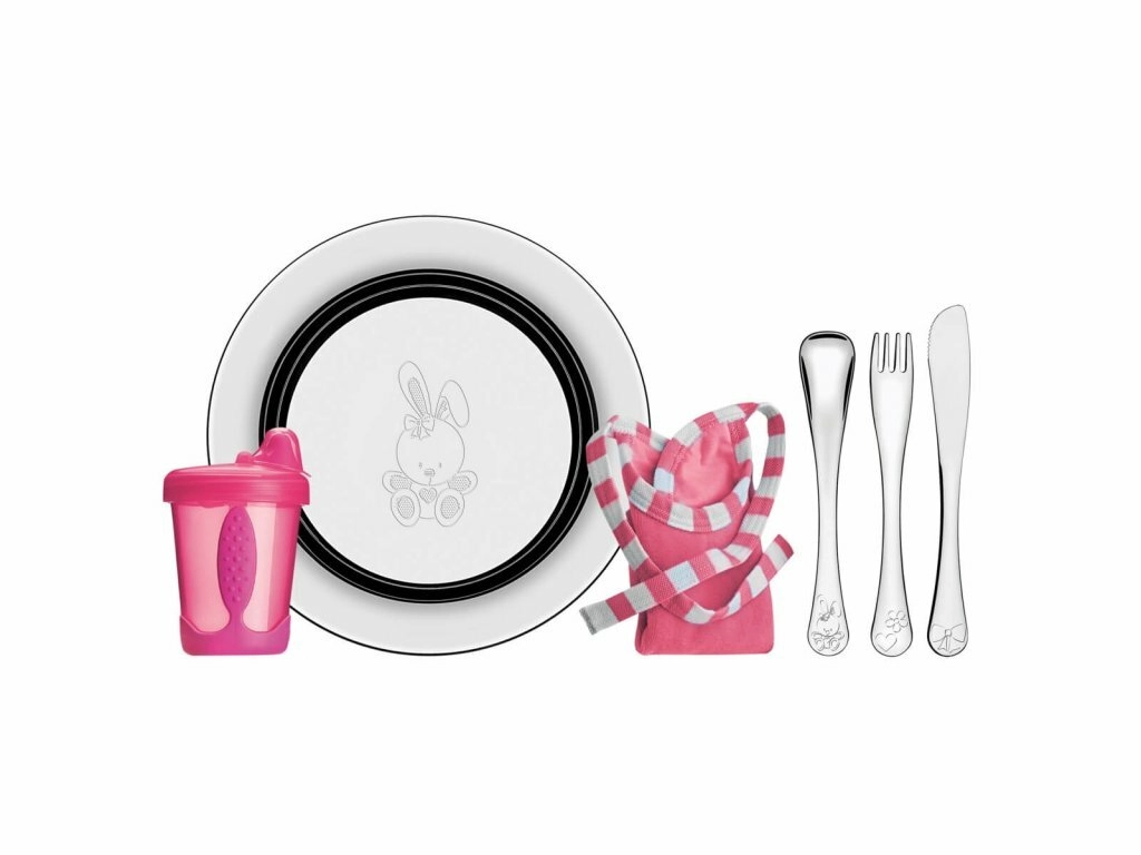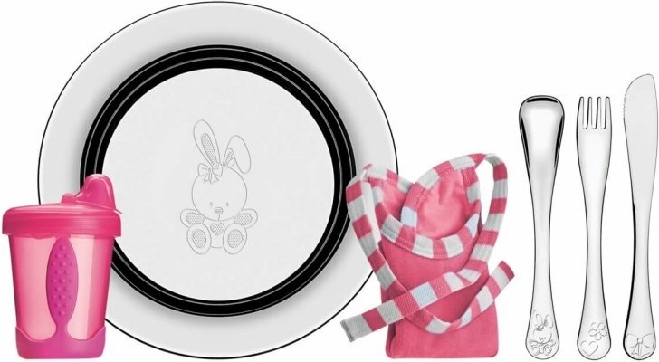 - Dziecięce sztućce ze stali nierdzewnej (widelec, łyżka, nożyk), dziecięcy talerz ze stali nierdzewnej, dziecięcy ślinak, zamykany plastikowy kubek 200 ml