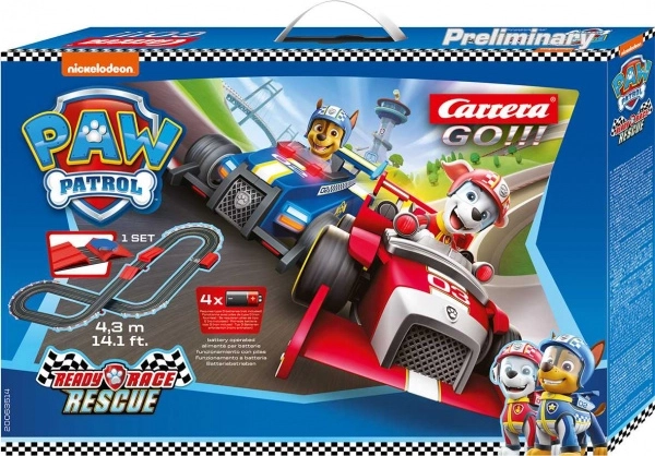 Autodrom Carrera GO Psi patrol 4,3 m z autkami Chase i Marshall. Skocznia, mostek, kontrolery, zasilanie na baterie. Dla dzieci od 5 lat.