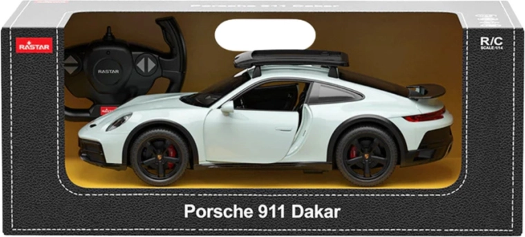Licencowany model Porsche 911 Dakar 1:14 od RASTAR oferuje realistyczny wygląd, płynne sterowanie 2,4 GHz oraz otwierane drzwi. Dzięki światłom LED, gumowym oponom i niezależnemu zawieszeniu ciesz się zabawą na różnych nawierzchniach z precyzyjną jazdą do przodu/tyłu oraz w lewo/prawo.