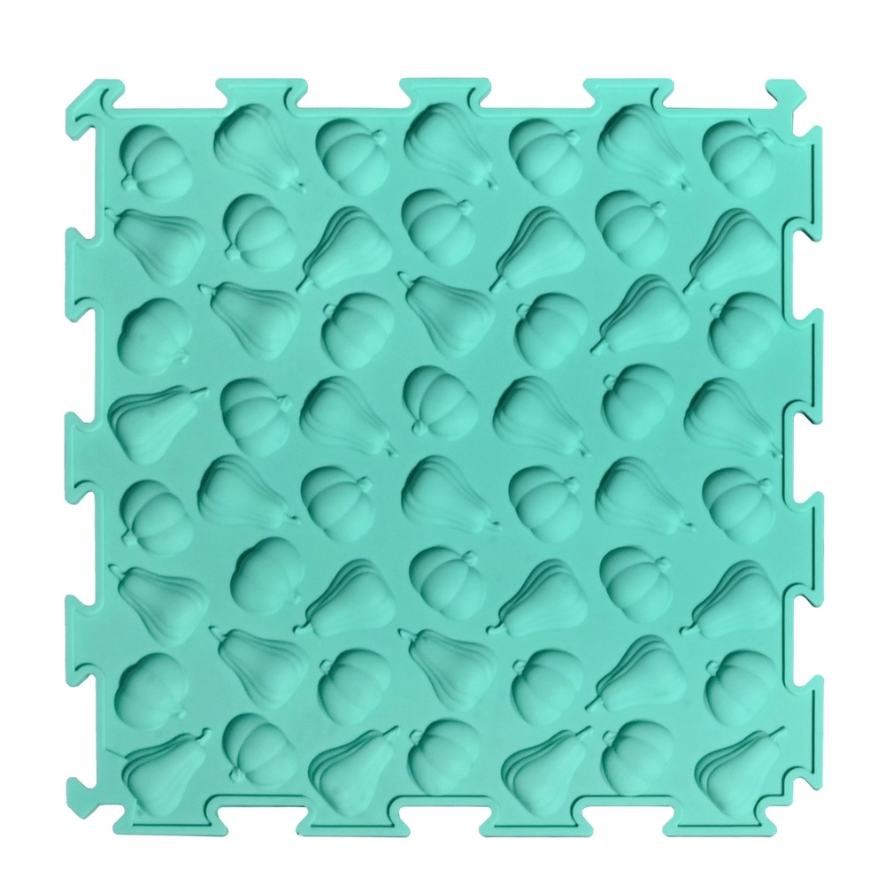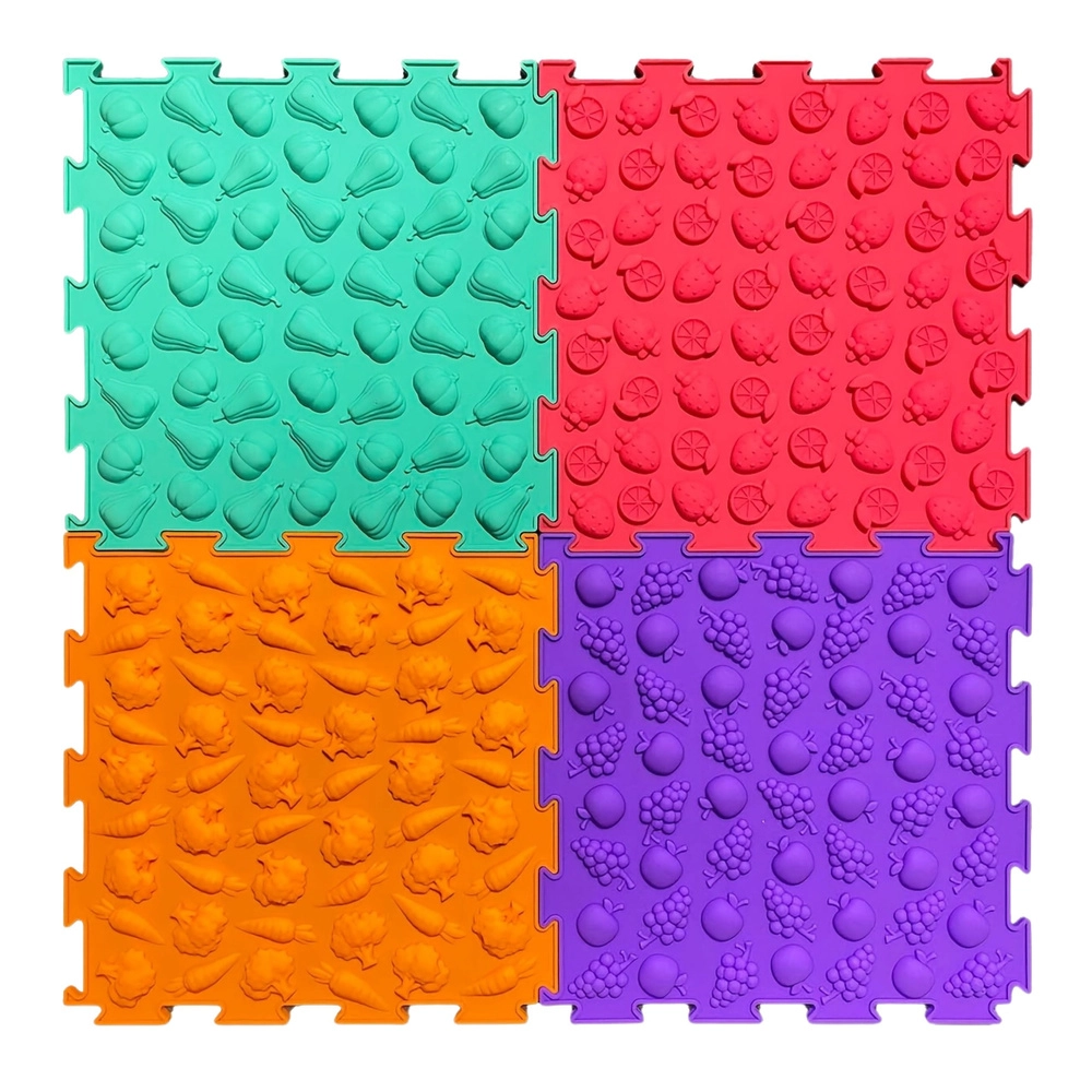 Każda płytka ma inną strukturę i relief (owoce, warzywa i zabawne wzory), które delikatnie masują stopy, wspierają krążenie i rozwijają zmysł dotyku.