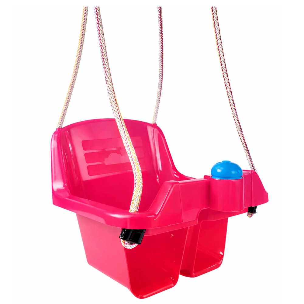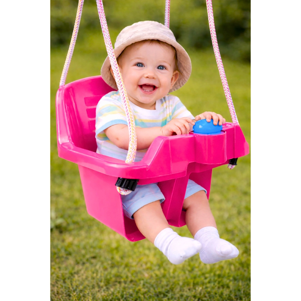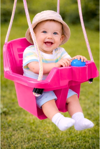 Ta różowa huśtawka dla dzieci została zaprojektowana z myślą o bezpiecznym i radosnym bujaniu już od około 10. miesiąca życia. Głębokie kubełkowe siedzisko i wysokie oparcie utrzymują dziecko we właściwej pozycji, a przednia barierka zapobiega wysunięciu. Dzięki solidnym linom nadaje się do zawieszenia zarówno wewnątrz, jak i na zewnątrz w ogrodzie.