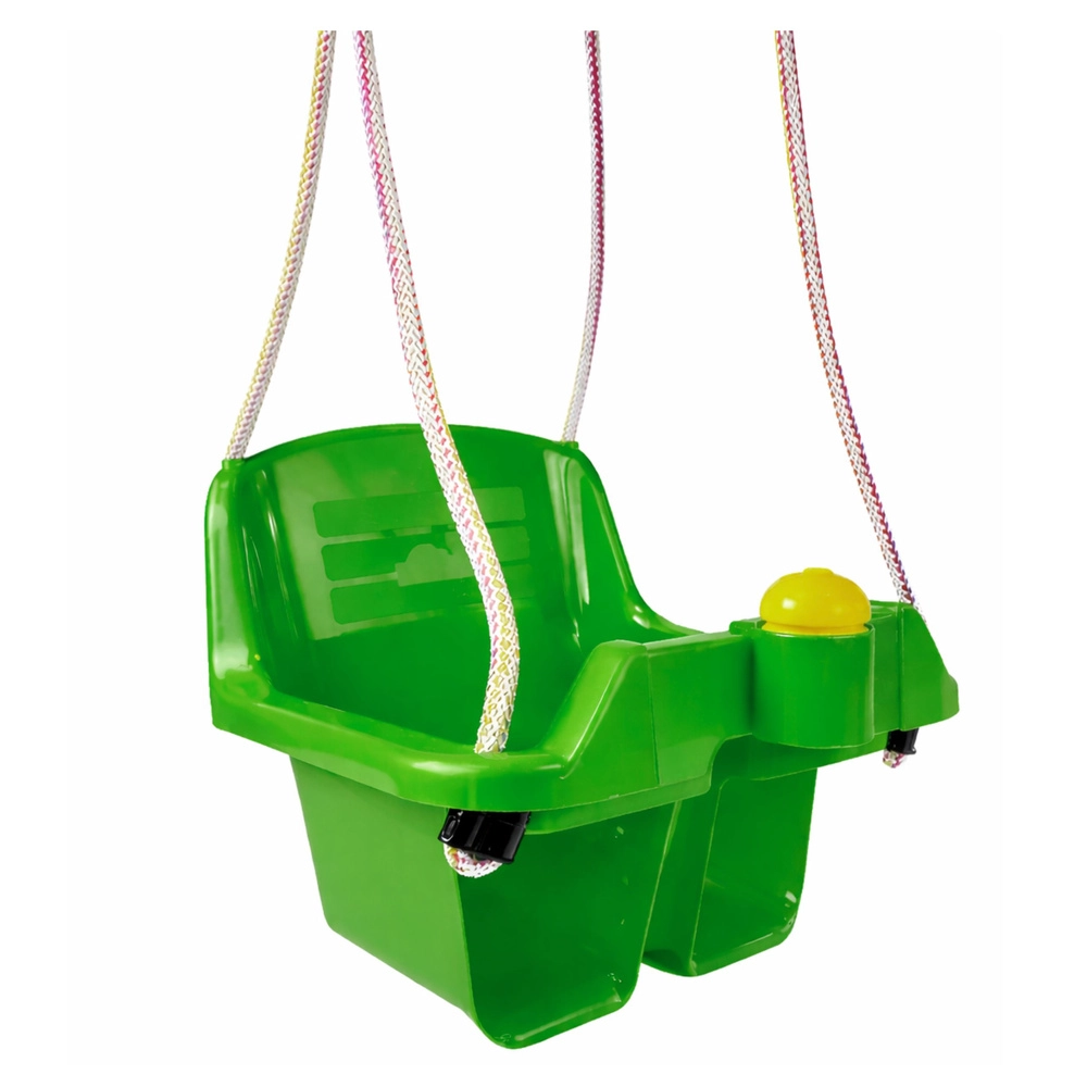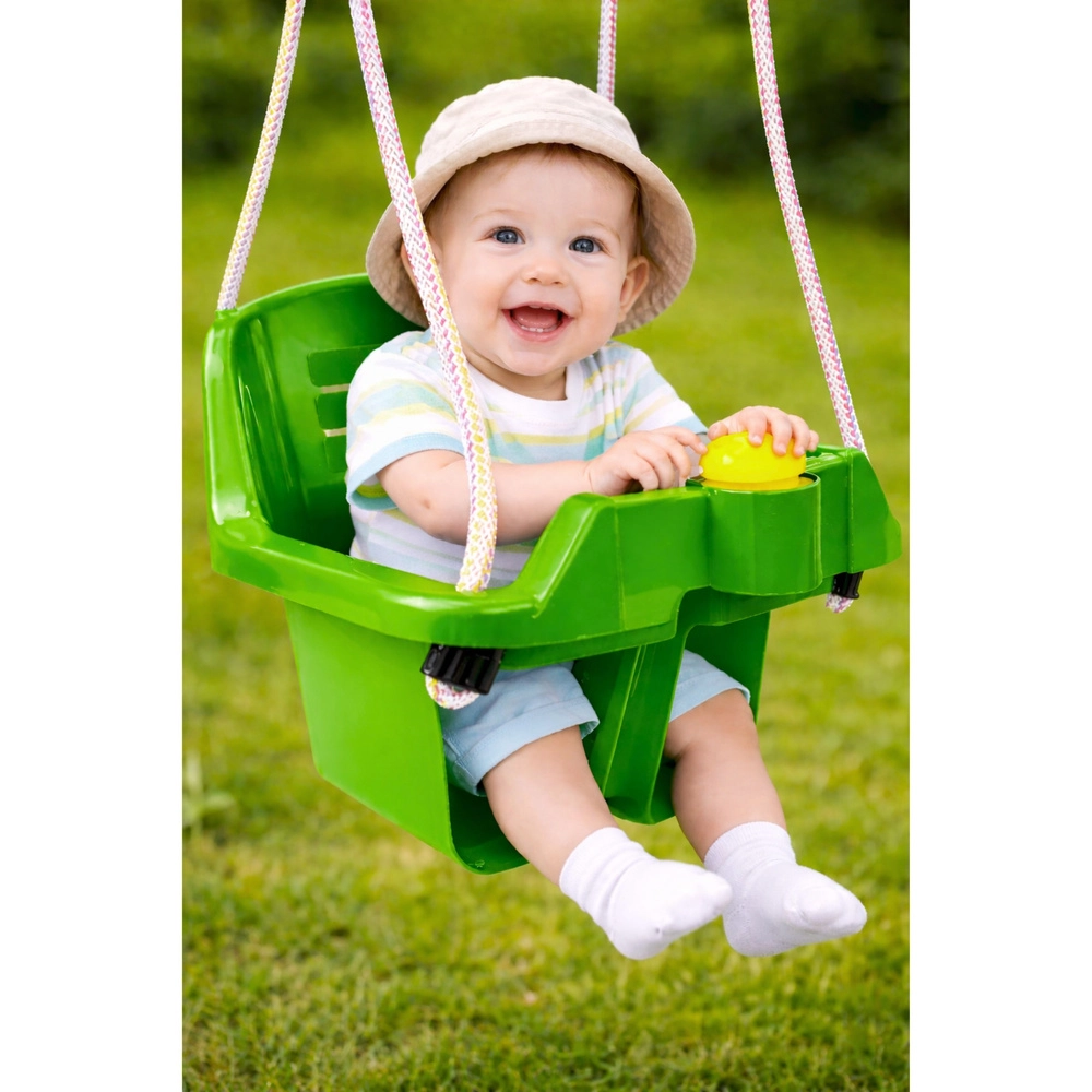 Zapewnij dziecku godziny zabawy i spokoju dzięki zielonej huśtawce wahadłowej z głębokim siedziskiem i wysokim oparciem. Dzięki przedniemu uchwytowi z klaksonem, mocnym linom i stabilnej konstrukcji huśtawka jest bezpieczna, wygodna i odpowiednia do wnętrz oraz ogrodu. Maksymalne obciążenie 19 kg, dla dzieci od 10 miesięcy.