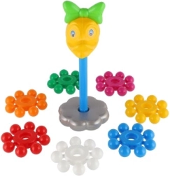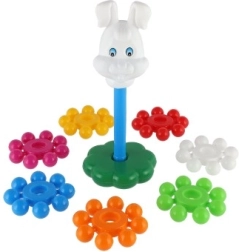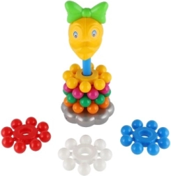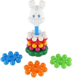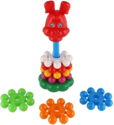 Szerokie, kolorowe krążki dobrze leżą w dziecięcych dłoniach i łatwo nawleka się je na środkowy pręt. Zabawa wspiera precyzję ruchów i trenuje koordynację oko–ręka już od pierwszych kroków.