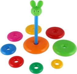Ta składana piramidka z kolorowymi krążkami to idealna pierwsza zabawka konstrukcyjna. Dzieci nawlekają krążki na pręt i układają je od największego do najmniejszego, dzięki czemu naturalnie trenują motorykę małą, cierpliwość i logiczne myślenie. Podstawę stanowi solidna plastikowa podstawa z prętem i zdejmowanym górnym elementem (w zależności od wariantu).