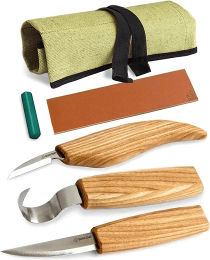 - Nóż do rzeźbienia łyżek SK1 (hakowy), nóż sloyd C4m, nóż do detali C8, pas do honowania LS2