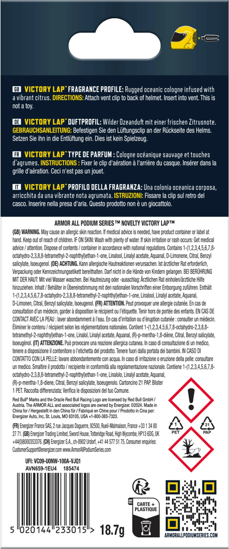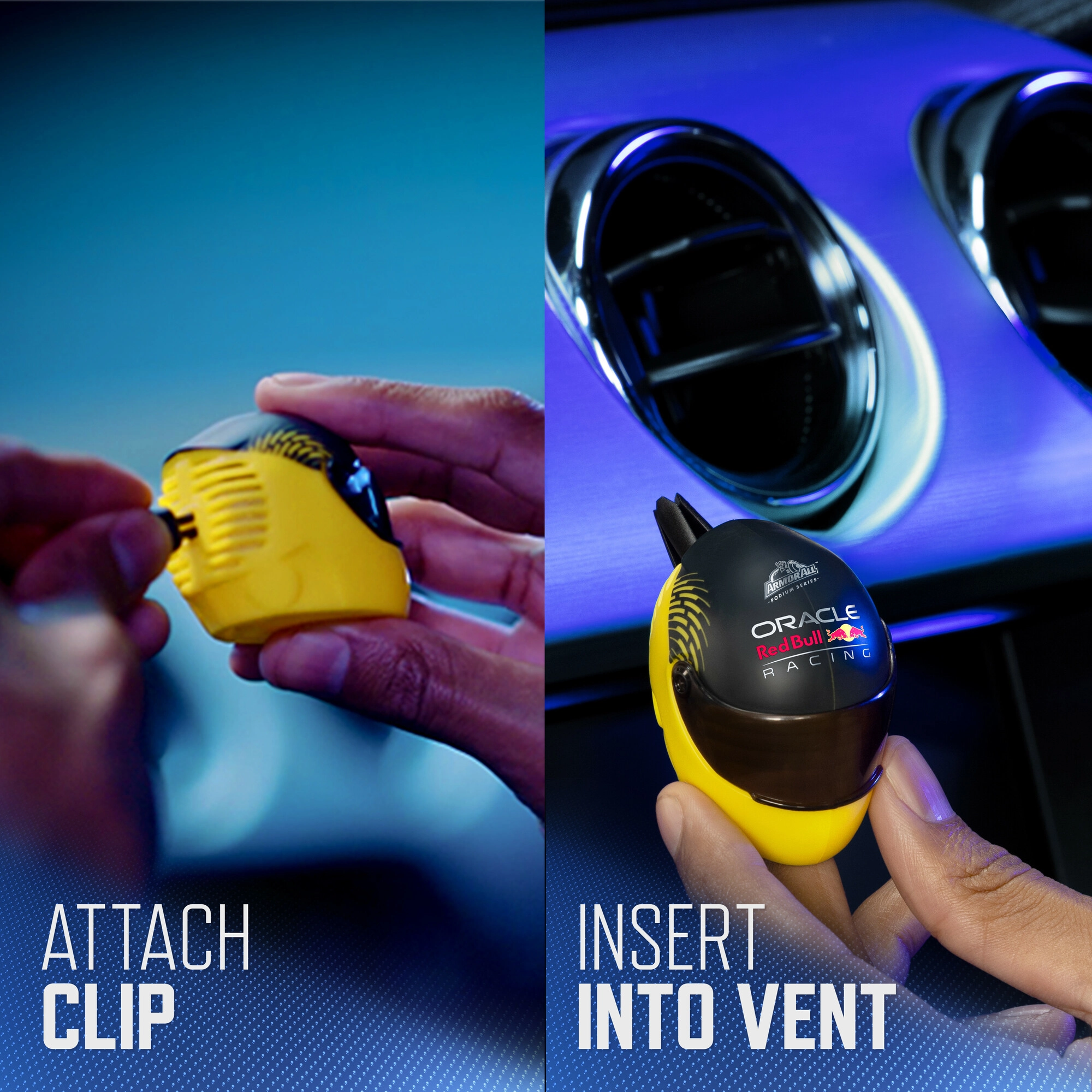 Stylowy 3D zapach do auta Armor All Oracle Red Bull Victory Lap – Helmet Vent zamieni każdy kilometr w przyjemne doświadczenie. Dzięki unikalnemu designowi inspirowanemu współpracą z ORACLE RED BULL RACING świetnie wygląda i jednocześnie pachnie. Łatwo mocuje się do większości wylotów wentylacji, ma regulowane okienko do kontroli intensywności zapachu i zapewnia odświeżającą mieszankę morskiej wody i cytrusów.