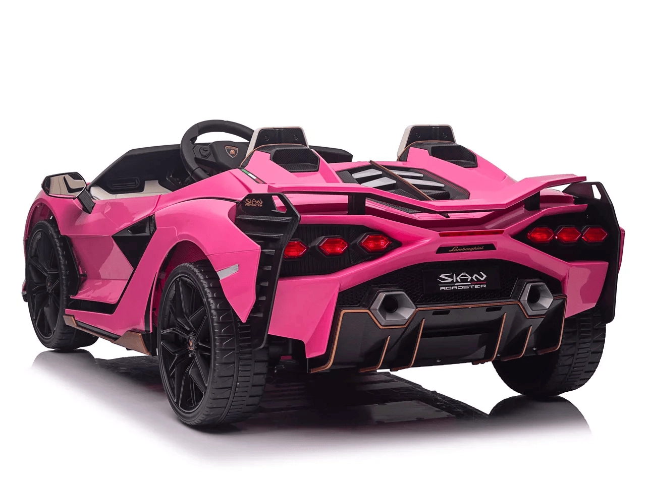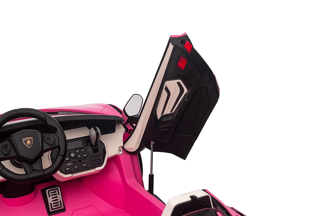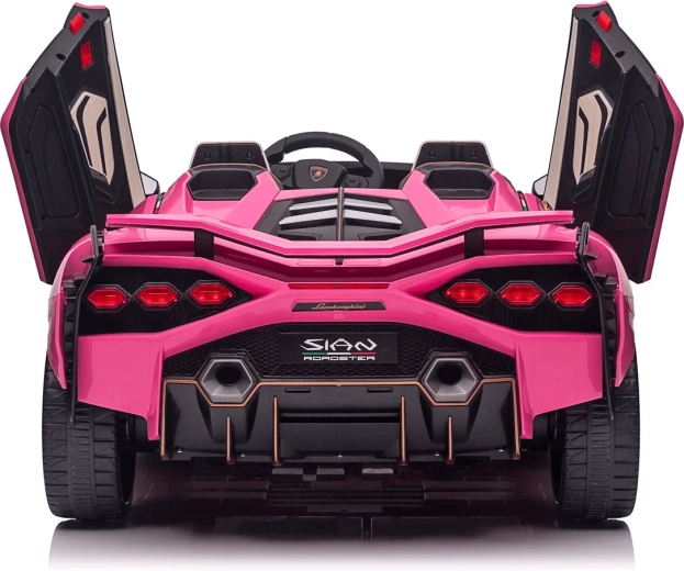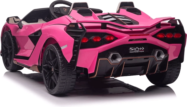 Stylowy dziecięcy elektryczny samochodzik Qileshi Lamborghini Sian w różowym kolorze łączy sportowy design, 4 wydajne silniki oraz bezpieczne sterowanie przez pilot 2,4 GHz. Oferuje podwójne siedzenie, otwierane drzwi, zawieszenie wszystkich kół oraz panel multimedialny z MP3/USB/Bluetooth dla maksymalnej zabawy.