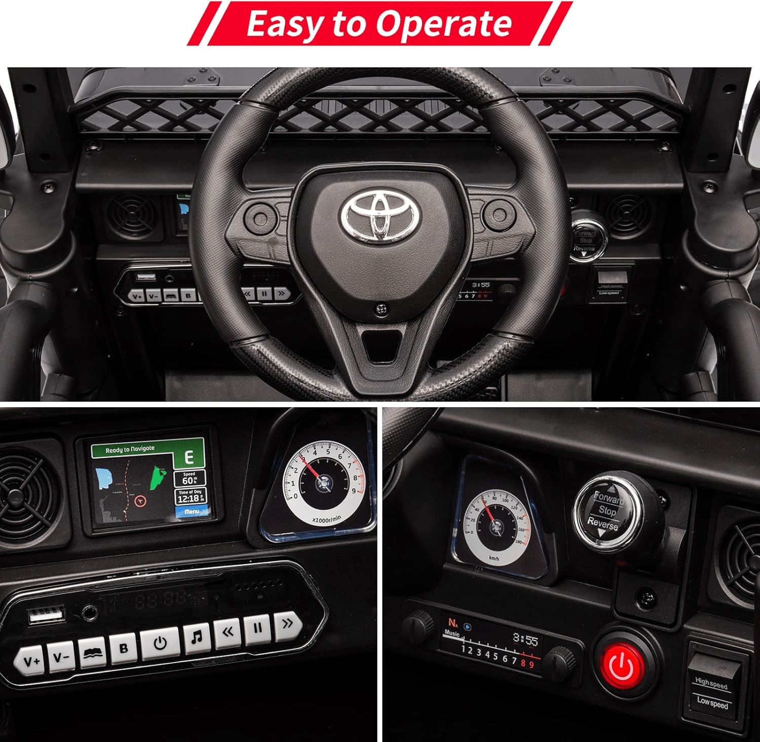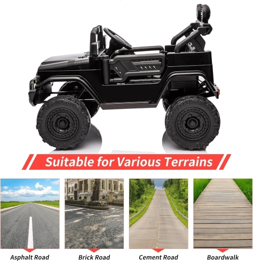 - Łatwa obsługa: kierownica i pedał dla dziecka, bieg przód/tył, otwierane drzwi dla wygodnego wsiadania.