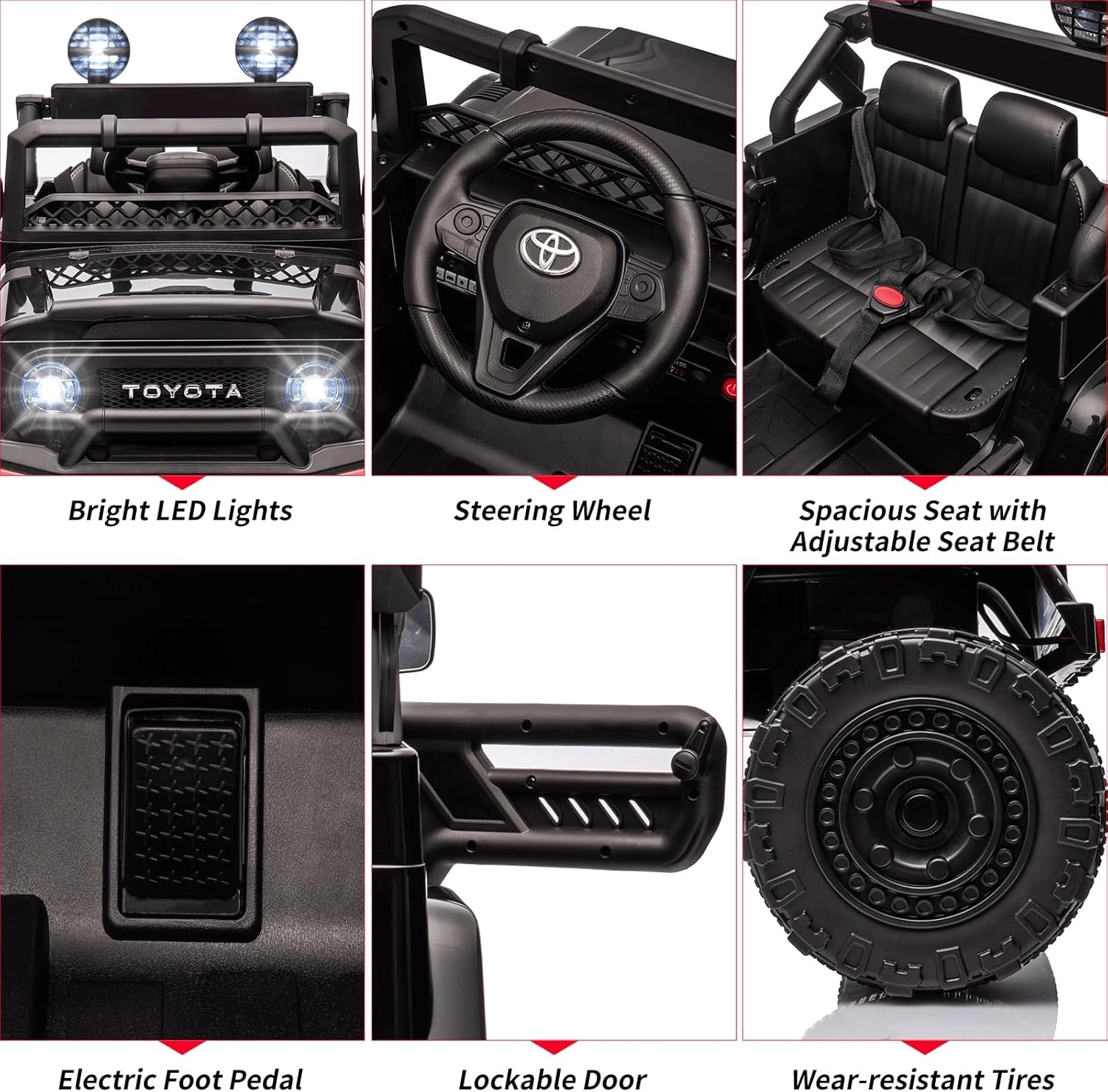 Stylowy dziecięcy elektryczny samochodzik inspirowany modelem TOYOTA oferuje realistyczne wrażenia z jazdy, sterowanie przez dziecko i rodzica za pomocą pilota 2,4 GHz, panel multimedialny z USB/AUX/MP3/SD/Bluetooth oraz bezpieczną, cichą jazdę dzięki kołom EVA, pasom bezpieczeństwa i siedzisku z eko skóry.