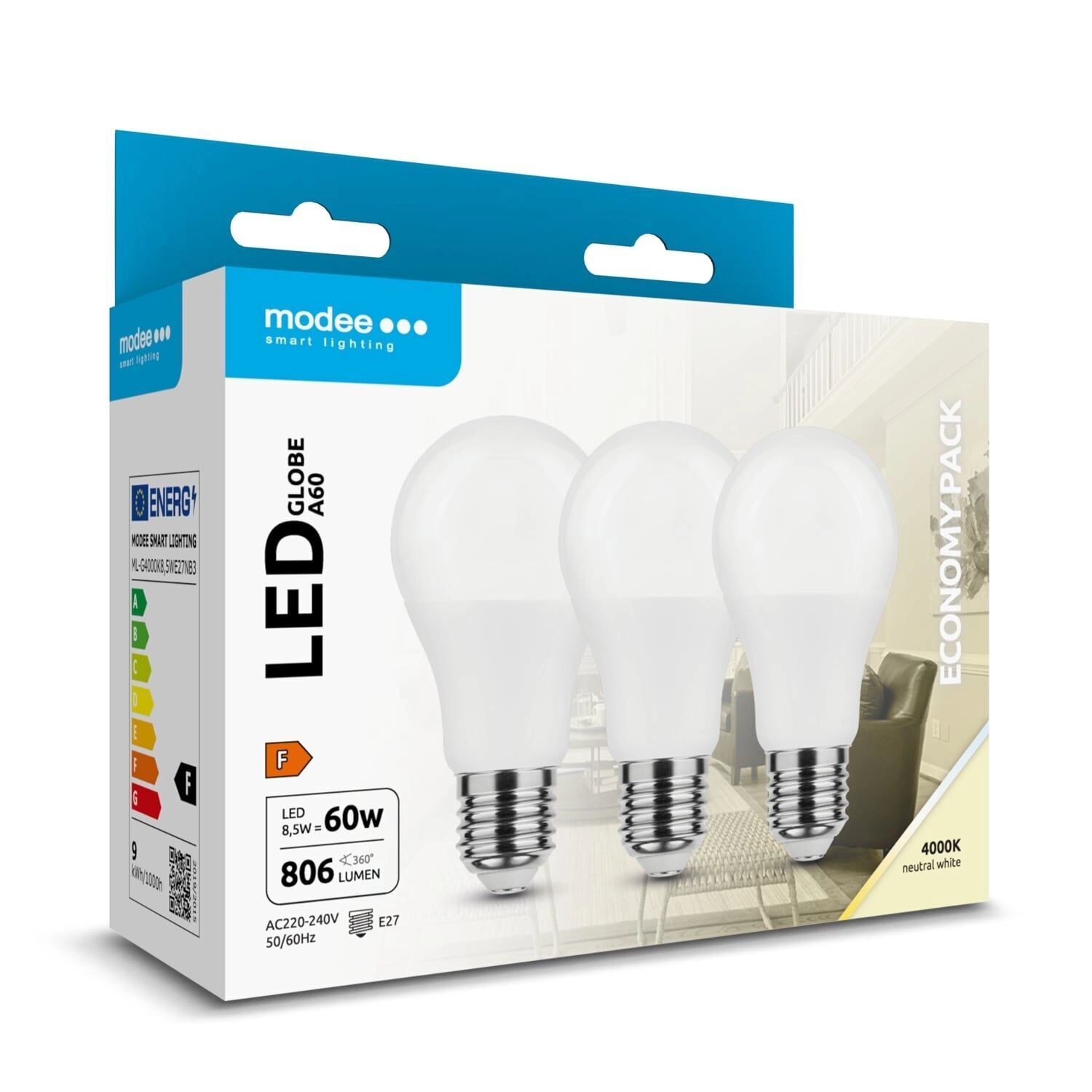 Żarówka LED Modee Globe A60 łączy wysoką efektywność energetyczną i niezawodność. Neutralna biała barwa światła 4000 K doskonale sprawdza się do pracy, czytania i codziennych czynności, ponieważ wiernie oddaje kolory (CRI > 80) i nie męczy oczu. Szeroki kąt świecenia 270° równomiernie oświetla pomieszczenie bez ostrych cieni.