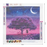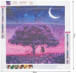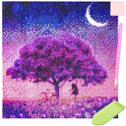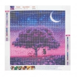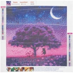 Motyw drzewa w różowo‑fioletowych tonach z półksiężycem tworzy urzekający, błyszczący efekt, który świetnie wygląda w ramie i bez niej. Malowanie diamentowe jest idealne do wyciszenia umysłu, rozwijania motoryki małej i kreatywności – odpowiednie dla początkujących i zaawansowanych.