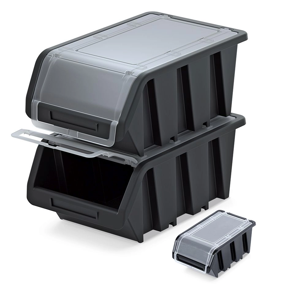 Dzięki przemyślanej konstrukcji możesz go piętrować, oszczędzając miejsce, lub przymocować do ściany przy użyciu specjalnej listwy lub płyty (nie wchodzi w skład zestawu). Haki z tyłu zapewniają szybki i prosty montaż. Świetny pomocnik na śrubki, elementy złączne, drobne narzędzia i akcesoria hobbystyczne.