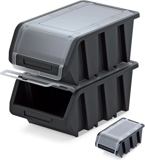 Praktyczny plastikowy pojemnik do przechowywania z przezroczystą, zamykaną pokrywą jest idealny do przejrzystego układania narzędzi, elementów złącznych i drobnych przedmiotów w warsztacie lub garażu. Dzięki wytrzymałej konstrukcji, możliwości sztaplowania oraz opcji zawieszenia na ścianie oszczędza miejsce i zapewnia szybki dostęp do zawartości bez konieczności otwierania.