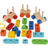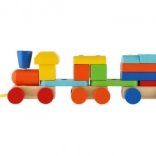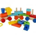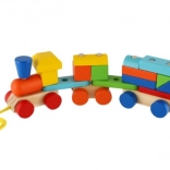 Ta pociągana zabawka i budowlanka to świetny sposób, jak dzieci mogą rozwijać swoje umiejętności i wyobraźnię. Kolorowy drewniany pociąg składa się z trzech solidnych podwozi i wielu elementów, które można dowolnie składać.