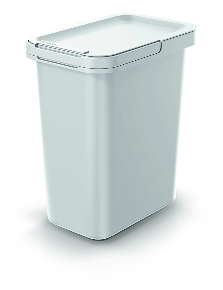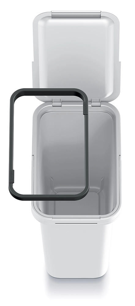 Uchylna pokrywa umożliwia szybkie i higieniczne wrzucanie odpadów bez niepożądanych zapachów. Zintegrowana wewnętrzna rama pewnie trzyma worek, zapobiega jego zsuwaniu się i ułatwia wymianę.