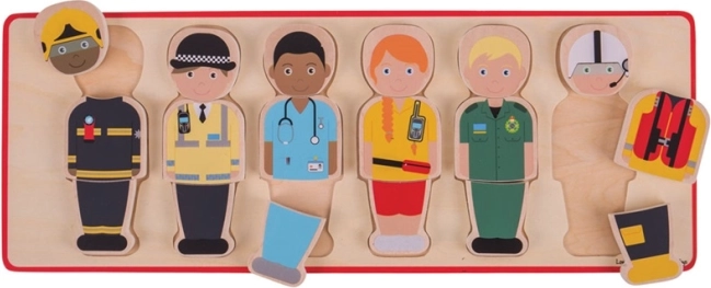 Uczyń naukę zabawną dzięki drewnianej układance Zespół ratowniczy. Ta kolorowa układanka oferuje sześć postaci ratowników — strażaka, policjanta, lekarza i inne, które pasują do wyciętych miejsc na planszy.