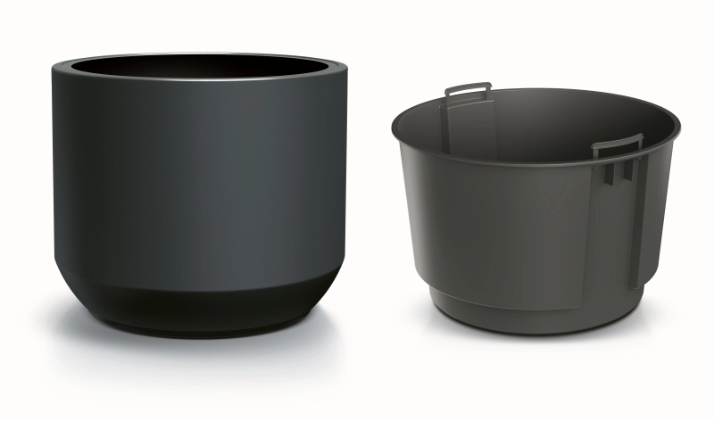 Zintegrowany wkład umożliwia lepsze odwadnianie i cyrkulację powietrza przy korzeniach, dzięki czemu rośliny rosną zdrowiej. Stabilny kształt z okrągłą podstawą trzyma się pewnie na miejscu i oferuje wystarczająco dużo przestrzeni dla większych roślin doniczkowych, krzewów ozdobnych czy palm.