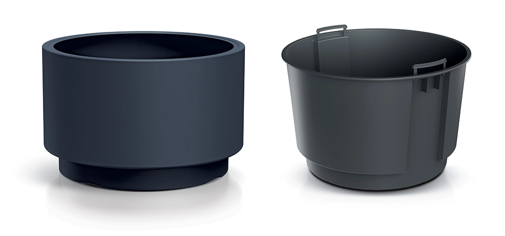 Dzięki wewnętrznemu wkładowi znacząco upraszcza się przesadzanie i podlewanie, a roślinom zapewnia optymalne warunki wzrostu. Pojemna donica umożliwia uprawę krzewów ozdobnych, traw oraz mniejszych drzew.