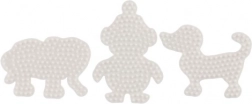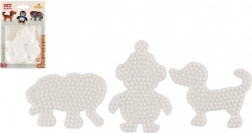 Zestaw podstawek Hama do koralików do prasowania pozwala dzieciom od 5 lat tworzyć kolorowe obrazki dziękibiałym plastikowym podkładkom w kształcie słonia, pingwina oraz pieska.