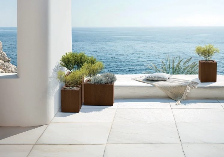 Minimalistyczny kanciasty kształt w rdzawobrązowym odcieniu doskonale współgra z naturalnymi materiałami i podkreśla zieleń na balkonie, tarasie oraz w salonie.