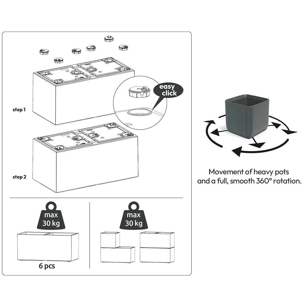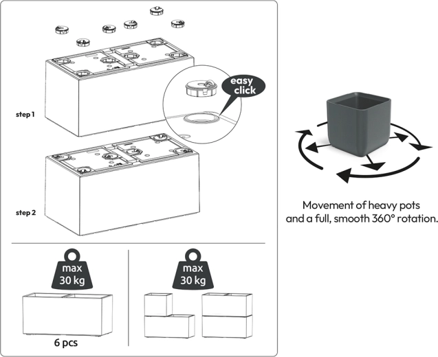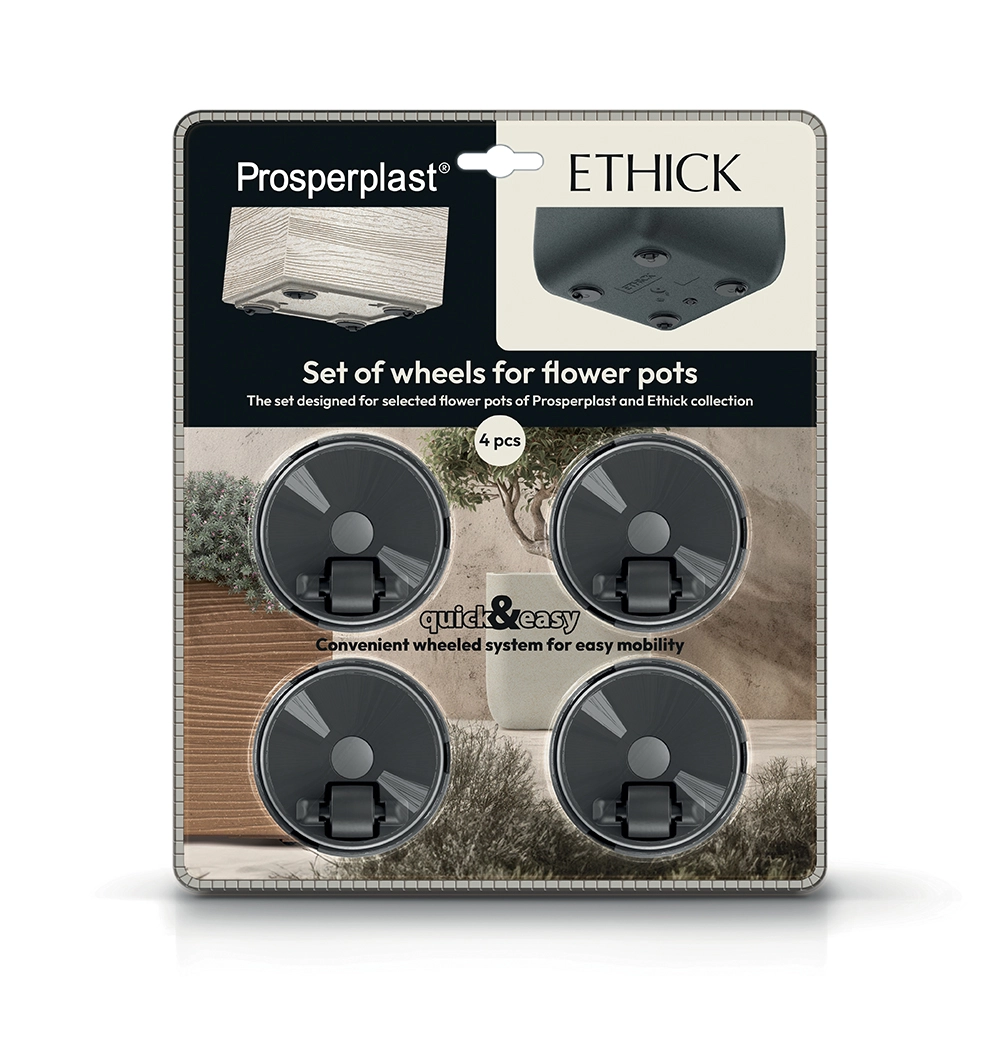 Zintegrowany system samonawadniania utrzymuje idealną wilgotność podłoża, dzięki czemu rośliny dobrze rosną nawet przy rzadszym podlewaniu. Nóżki z imitacją drewna zapewniają stabilność, lepsze wentylowanie dna oraz elegancki wygląd zarówno na tarasie, jak i w salonie.