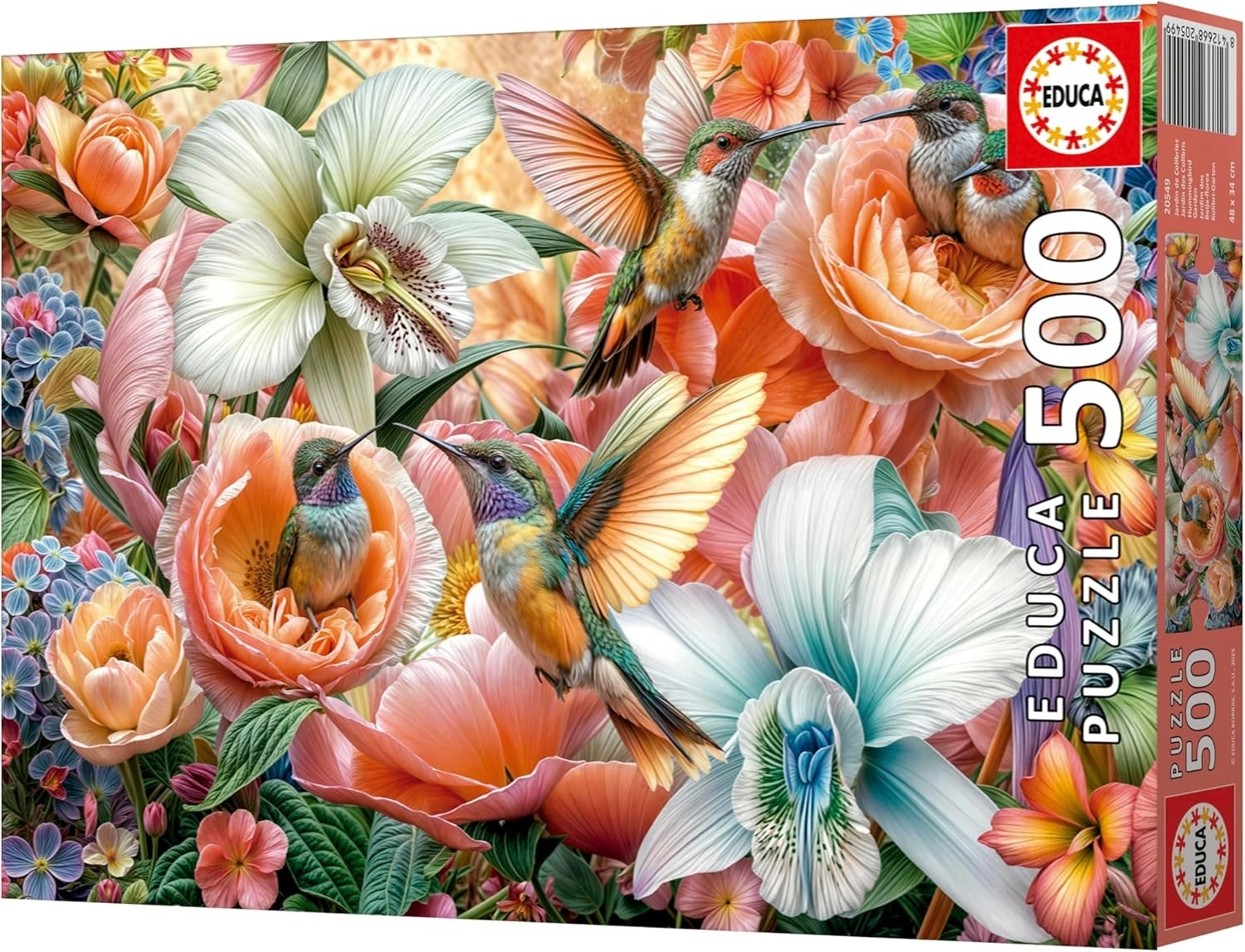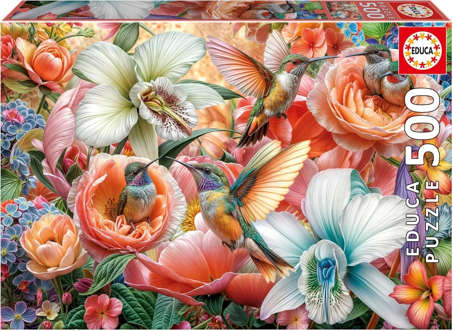Ciesz się chwilami spokoju i koncentracji z puzzlami EDUCA z motywem rozkwitającego ogrodu i eleganckich kolibrów. Dzięki 500 elementom to idealny wybór dla początkujących i zaawansowanych, którzy szukają przyjemnego wyzwania i pięknego końcowego obrazu o wymiarach ok. 48 × 34 cm.