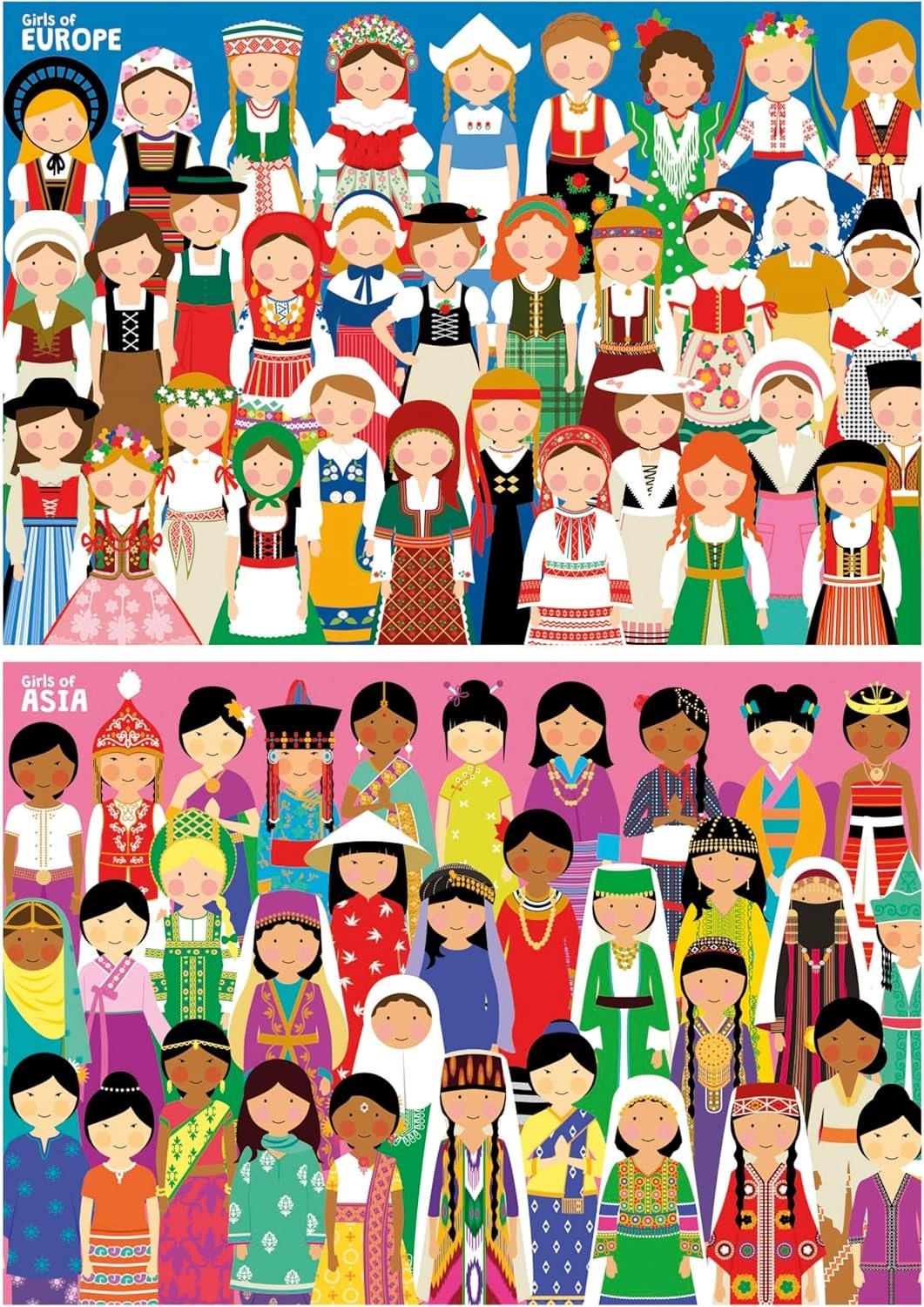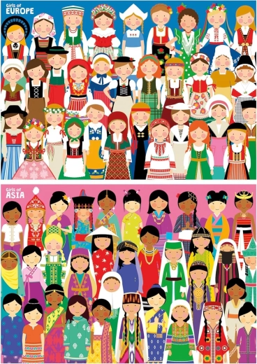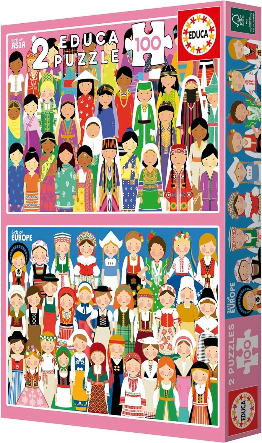 Odkryj urok świata z podwójnym zestawem wysokiej jakości puzzli marki EDUCA. Opakowanie zawiera dwa różne układanki po 100 elementów, idealne dla dzieci i początkujących miłośników puzzli. Po ułożeniu każde puzzle mają wymiary ok. 40 × 28 cm i zachwycają subtelnymi ilustracjami dziewczynek z Europy i Azji.