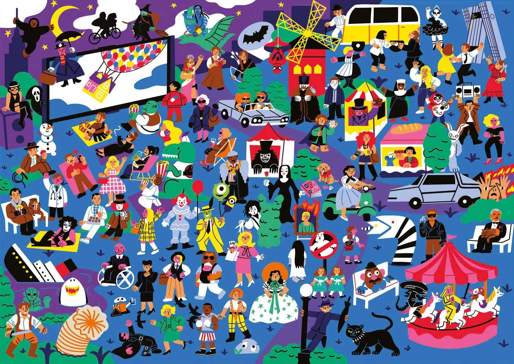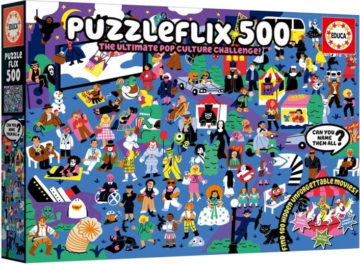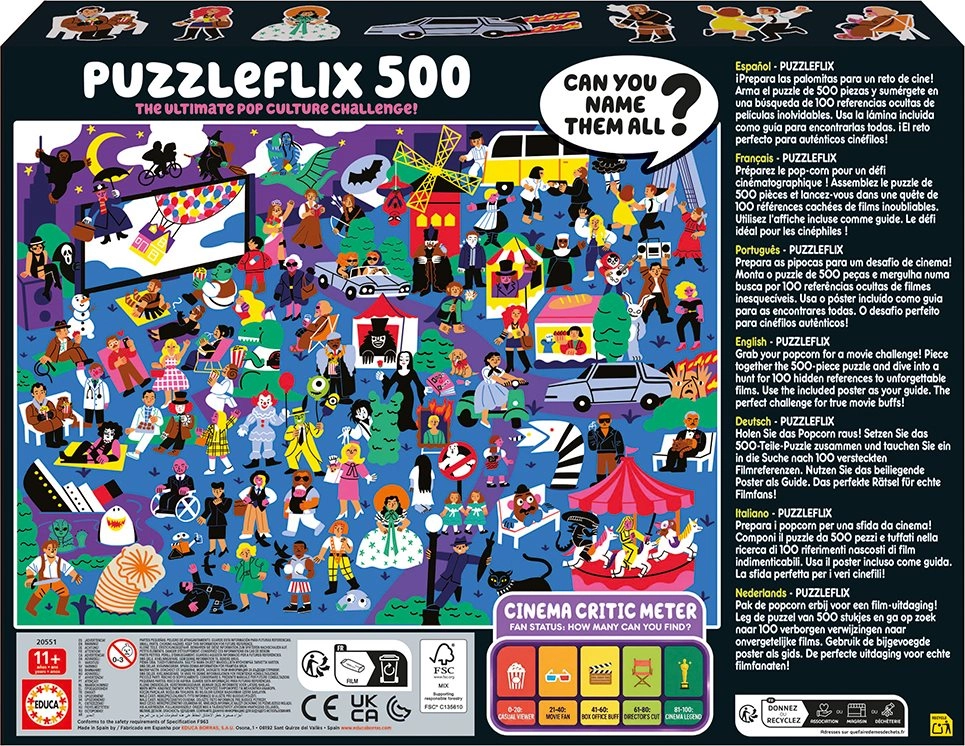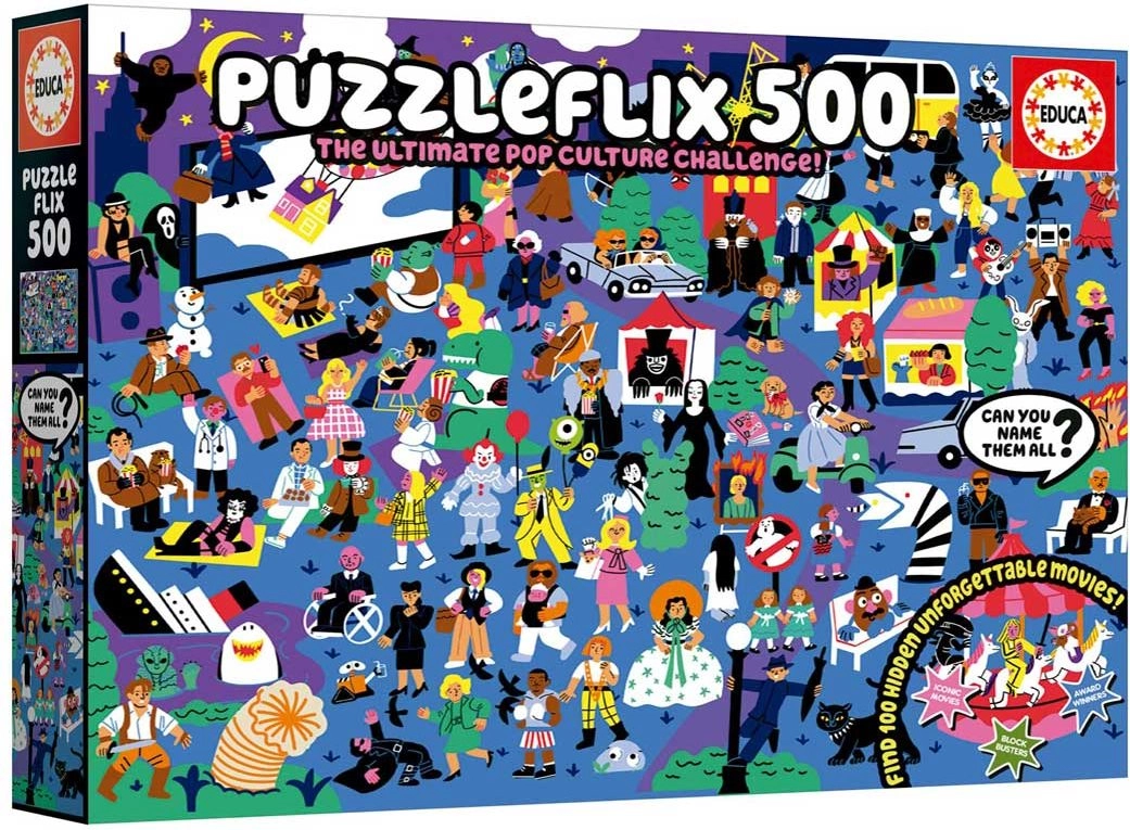 Odkryj świat kinematografii, układając oryginalne puzzle EDUCA Puzzleflix. Na ilustracji ukryto 100 odniesień do niezapomnianych filmów, które ucieszą zarówno doświadczonych fanów kina, jak i miłośników zagadek. Dołączony plakat posłuży jako podpowiedź i przewodnik, abyś nie przeoczył żadnego detalu.