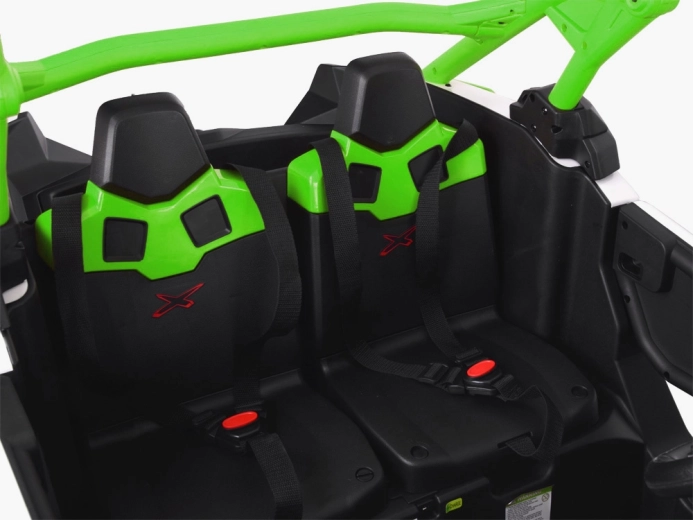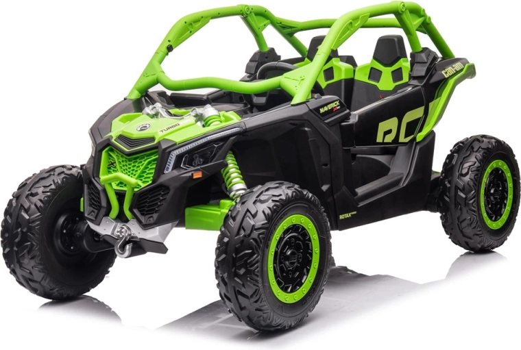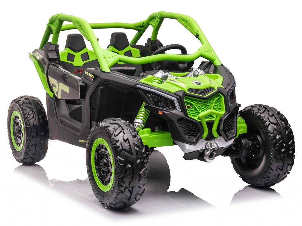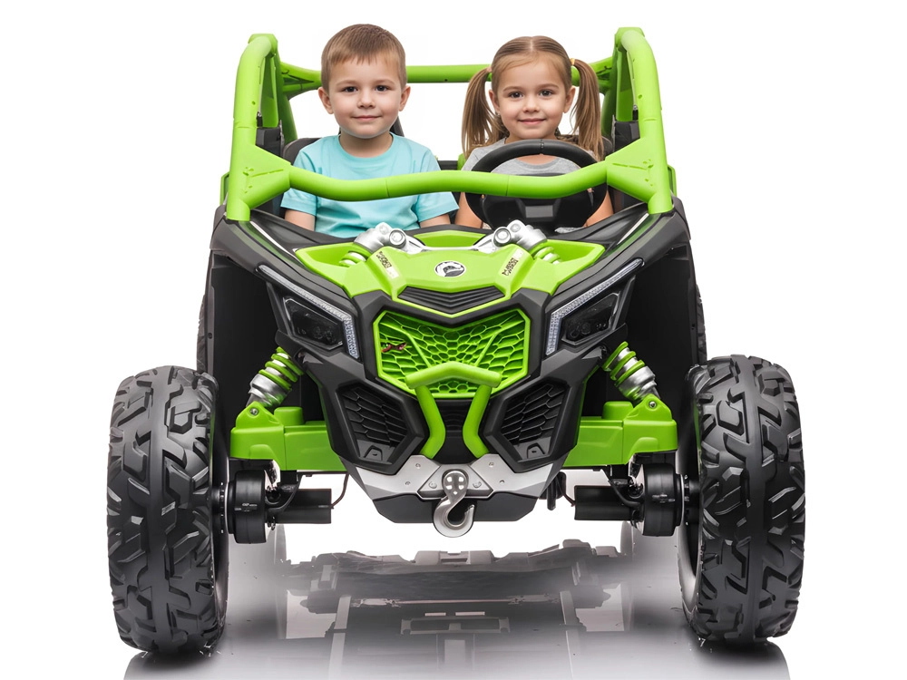 Terenowy samochód elektryczny dla dzieci wyróżnia się stabilną konstrukcją, komfortowym miejscem dla dwojga oraz dopracowanymi detalami. Napęd na cztery koła wspierają resorowane osie i miękkie opony EVA, które zapewniają świetną trakcję na trawie, żwirze i nierównościach. Rodzice mają wszystko pod kontrolą dzięki pilotowi 2,4 GHz z możliwością przełączania między sterowaniem manualnym a RC.