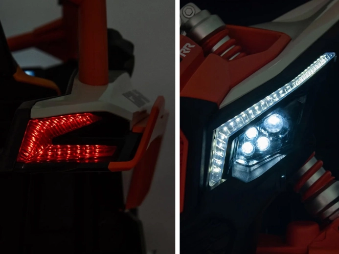 Za zabawę odpowiada panel multimedialny z USB, gniazdem microSD i wejściem MP3, nie brakuje przycisku start/stop z dźwiękiem silnika, świateł LED z przodu i z tyłu oraz pasów bezpieczeństwa. Otwierane drzwi ułatwiają wsiadanie, a wysoki prześwit nadaje pojazdowi prawdziwy off‑roadowy wygląd.