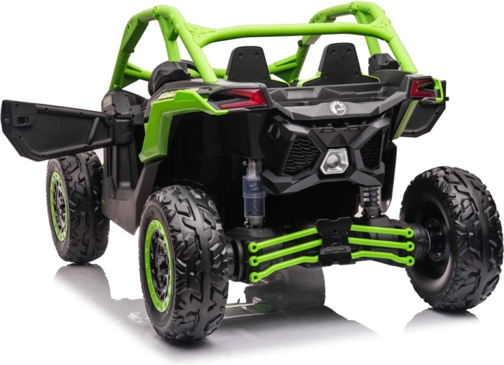 Cztery silniki z zasilaniem 24V oraz widoczne sprężyny zapewniają płynną jazdę nawet po nierównym podłożu. Dzieci zyskują stabilność, trakcję i pewność w terenie.