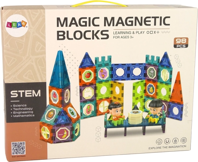 Odkryj kreatywny świat z magnetycznymi klockami z 98 elementami, które pozwalają budować konstrukcje 3D takie jak zamek czy diabelski młyn. Wspierają motorykę małą, logiczne myślenie i kreatywność. Elementy z magnesami i zatrzaskami łatwo się łączą i rozkładają. W zestawie znajdują się naklejki ze zwierzętami, owocami i warzywami, 2 figurki oraz instrukcja. Bezpieczne, trwałe materiały, certyfikat CE, odpowiednie od 3 lat.
