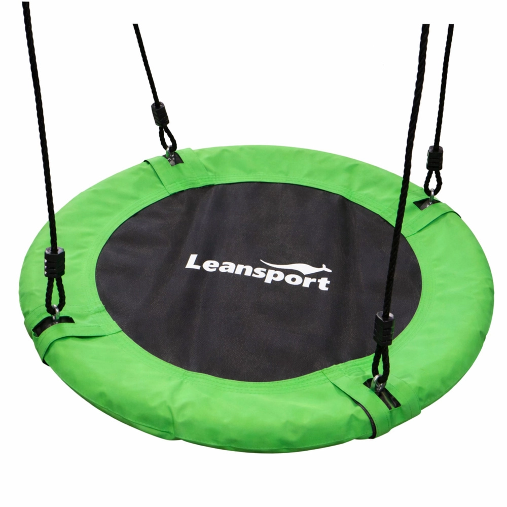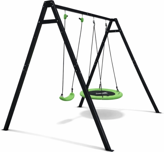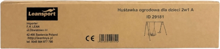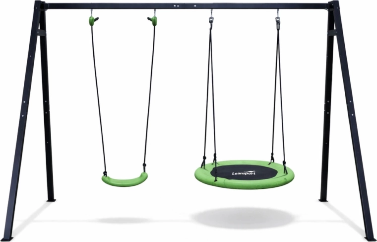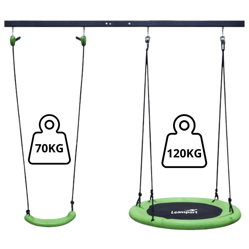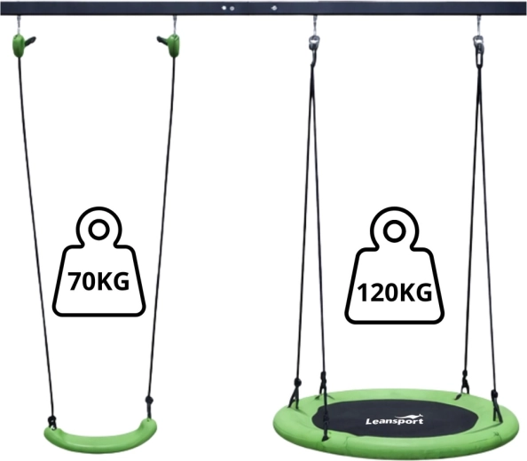 W opakowaniu znajdziesz dwa typy siedzisk: gniazdo o średnicy 80 cm do wygodnego bujania i odpoczynku oraz klasyczne ergonomiczne siedzisko 36 × 18 cm do dynamicznej jazdy. Regulowane liny pozwalają dopasować wysokość do potrzeb dziecka. Wykonanie jest odporne na warunki atmosferyczne, dzięki czemu zestaw pozostaje estetyczny i funkcjonalny przez długi czas.