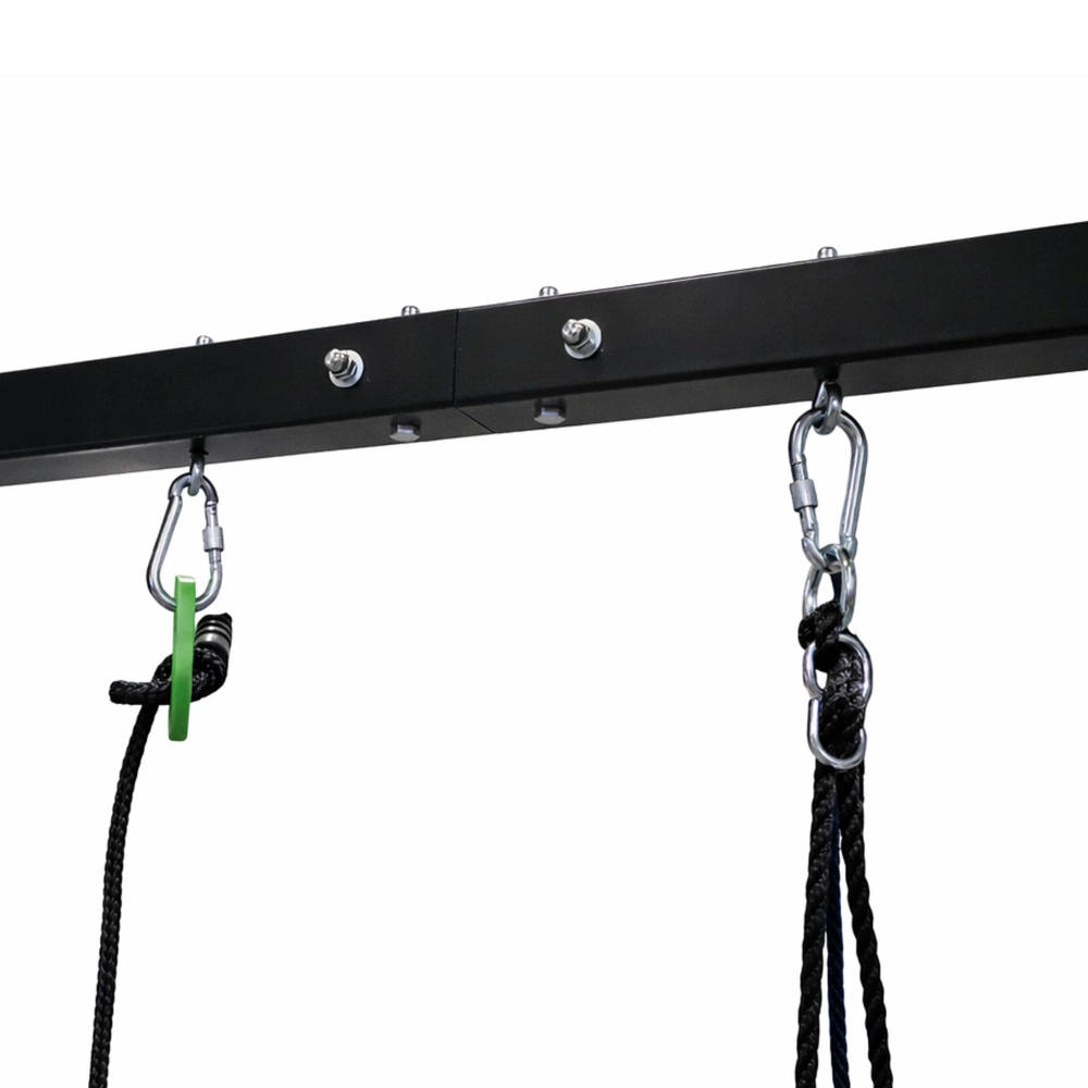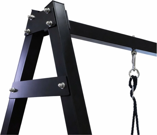 - Stalowa rama, 2× siedzisko, liny montażowe, zestaw kotwiący, elementy montażowe