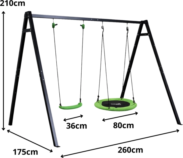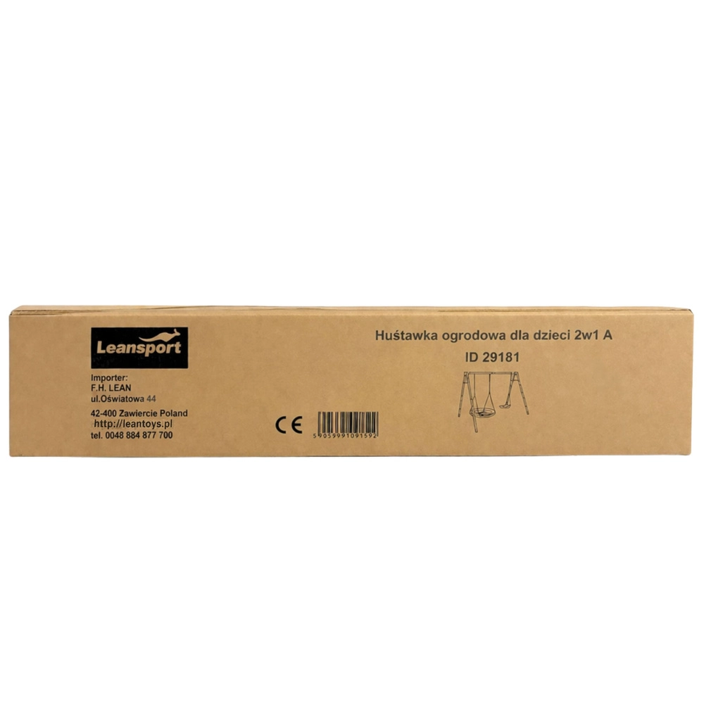Ogrodowa huśtawka 2w1 dla dzieci łączy stabilną stalową ramę z dwoma siedziskami – gniazdowym i klasycznym. Oferuje bezpieczną zabawę na świeżym powietrzu, wysoką nośność do 200 kg oraz odporność na warunki pogodowe. Idealna do ogrodu, na podwórko i plac zabaw.