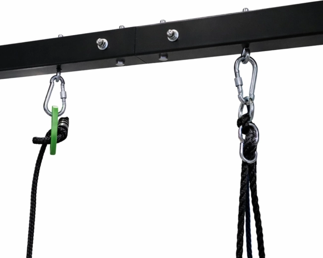 Trwałe liny z karabińczykami umożliwiają szybkie mocowanie i regulację wysokości siedzisk w zależności od wieku i potrzeb dzieci.
