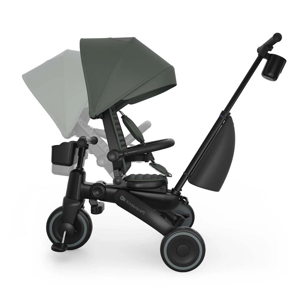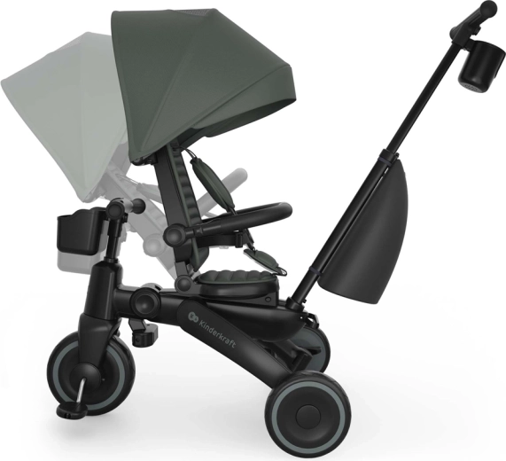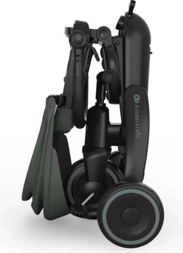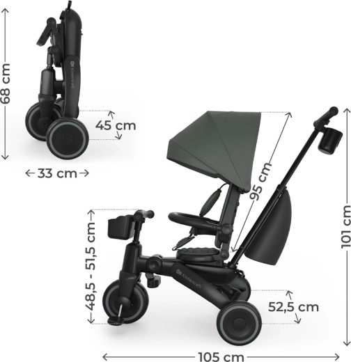 Składana rama z podwójnym zabezpieczeniem zapewnia szybkie i bezpieczne złożenie do kompaktowych wymiarów. Trójkołowiec można stabilnie przechowywać w pozycji pionowej lub poziomej – docenisz to w mieszkaniu, windzie i bagażniku auta. Duża budka z filtrem UPF 50+ i hydrofobową powłoką chroni przed słońcem i lekkim deszczem, a panel wentylacyjny i okienko peek-a-boo poprawiają cyrkulację powietrza i kontakt z dzieckiem.