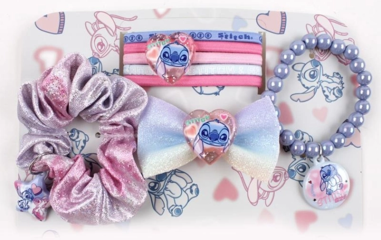 Rozświetl każdą fryzurę uroczym zestawem akcesoriów do włosów w stylu STITCH. W praktycznej saszetce znajdziesz spinki, gumki, miękką scrunchie oraz pasującą bransoletkę – wszystko idealne na co dzień i na specjalne okazje.