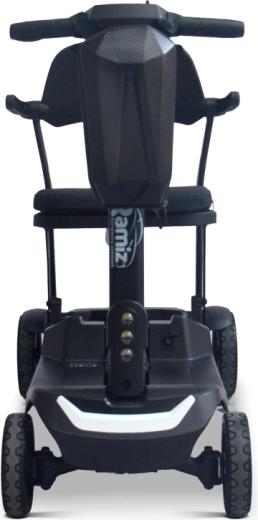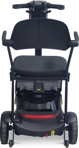 Komfort zapewnia wodoodporne materiałowe siedzisko z miękkimi podłokietnikami i pokrowcem na zamek dla łatwego prania. Praktyczne wyposażenie obejmuje akustyczny klakson, dźwięk podczas cofania oraz czytelny wyświetlacz z wskaźnikiem stanu baterii, prędkości i przebiegu. Do dyspozycji jest przednia szybko odpinana torba oraz kosz pod siedziskiem.