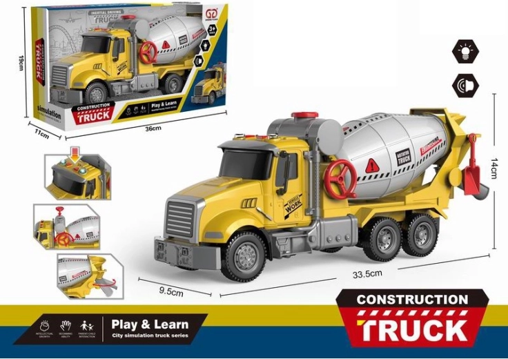 Ta żółta dziecięca betoniarka wiernie odwzorowuje prawdziwą maszynę budowlaną. Wystarczy ją popchnąć, a dzięki napędowi ciernemu sama ruszy. Autentyczne dźwięki mieszania cementu i odgłosy placu budowy wraz z efektami świetlnymi wciągną dzieci w świat budowy i pobudzą ich wyobraźnię.