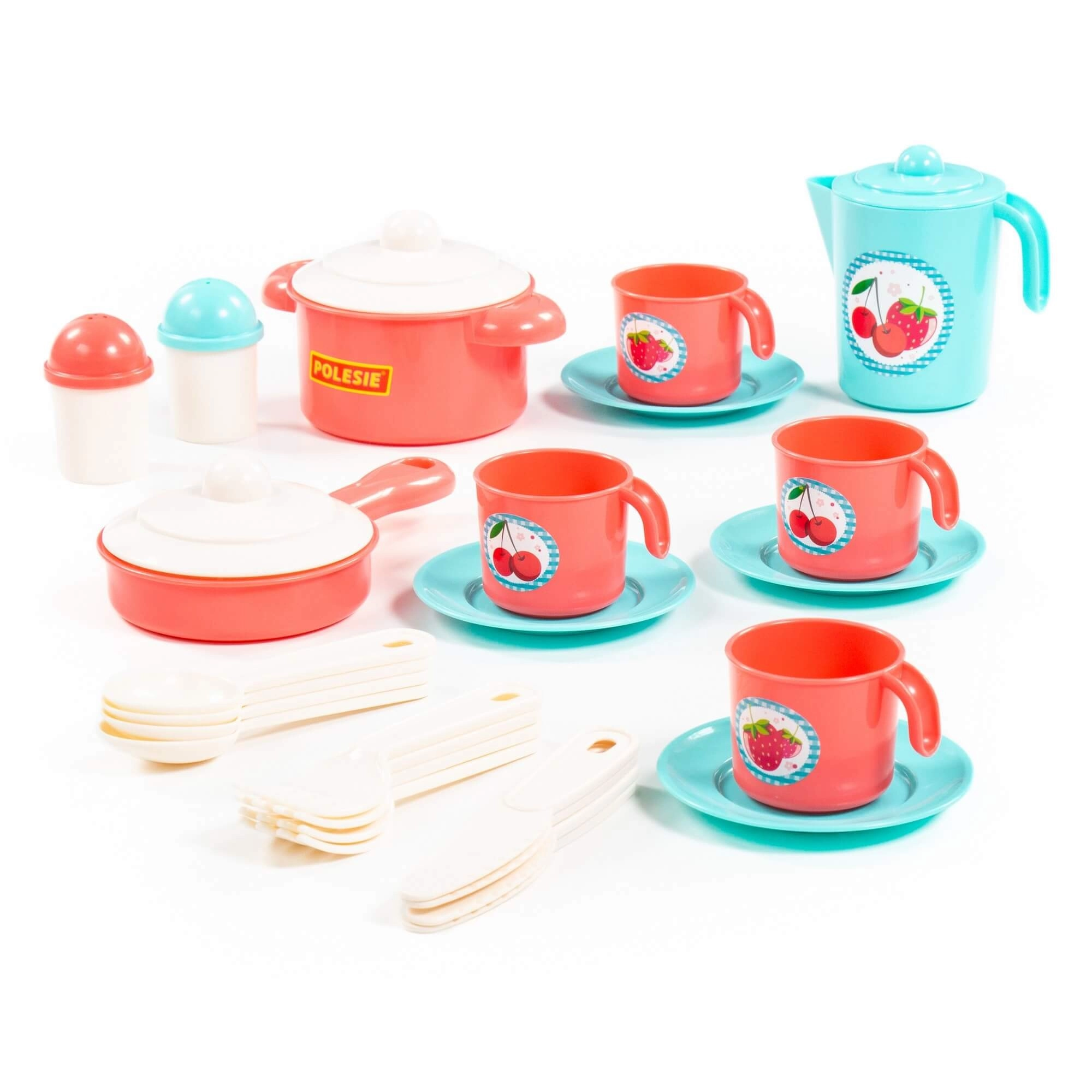 Z zestawem Nastenka dzieci doświadczą realistycznej zabawy w gotowanie i nakrywanie do stołu. Zestaw obejmuje dzbanek, garnek z pokrywką, patelnię z pokrywką, filiżanki ze spodkami, solniczkę i pieprzniczkę oraz komplet łyżeczek i narzędzi kuchennych w atrakcyjnych koralowych i turkusowych kolorach z radosnymi motywami owoców.
