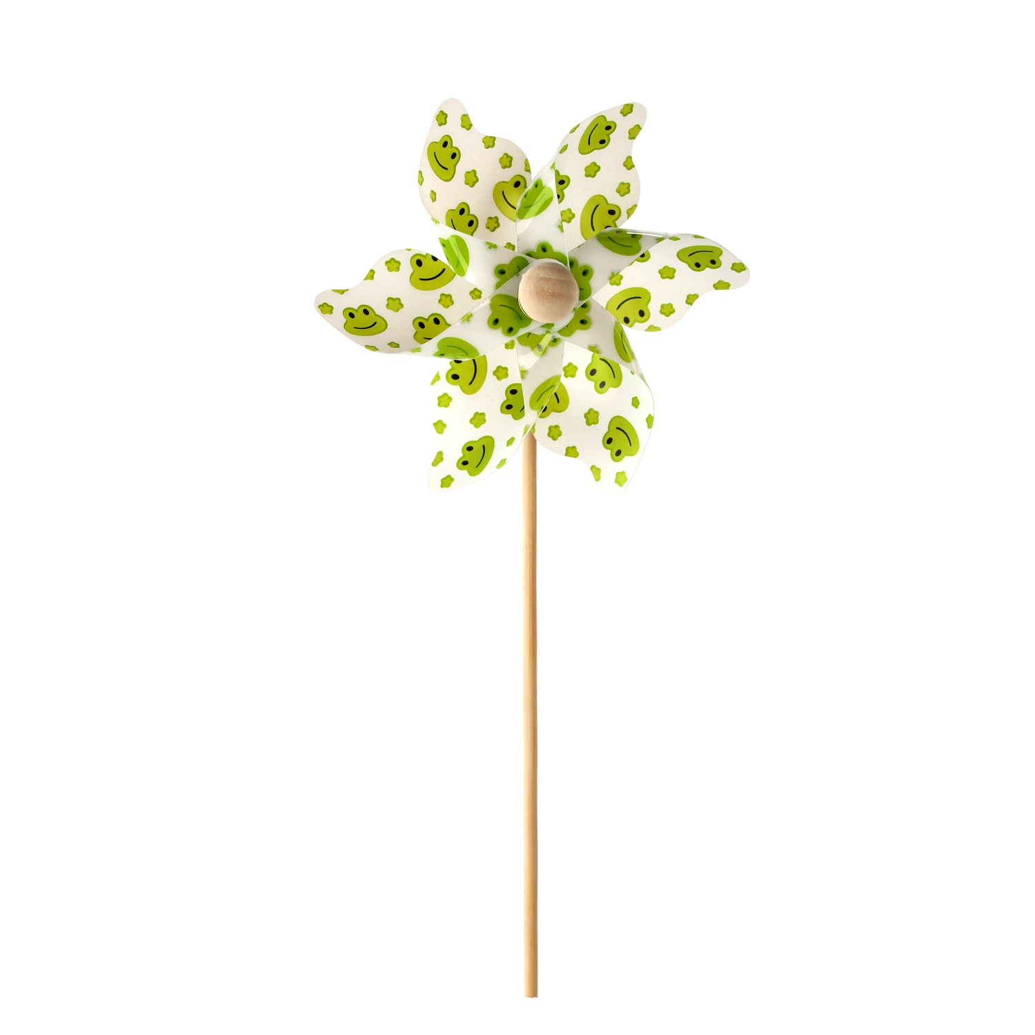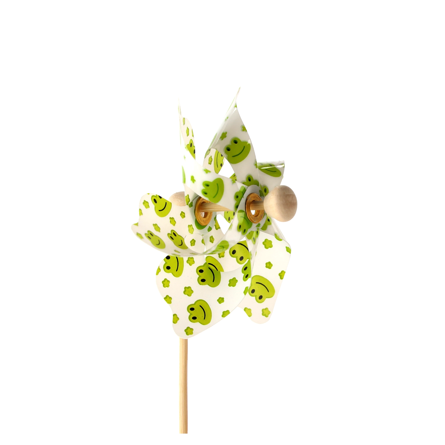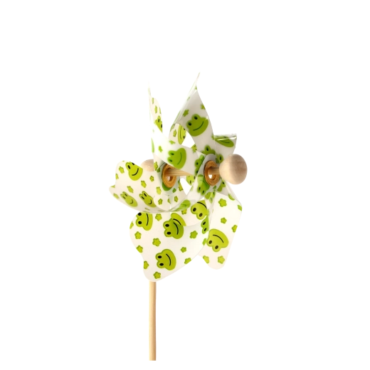 Wiatraczek z żabkami to urocza dekoracja dla dzieci i dorosłych. Dzięki lekkim łopatkom z PVC łatwo się obraca nawet przy lekkim wietrze i dodaje przestrzeni ruchu, koloru i radości. Naturalny bambusowy patyk zapewnia stabilność i przyjemny wygląd.