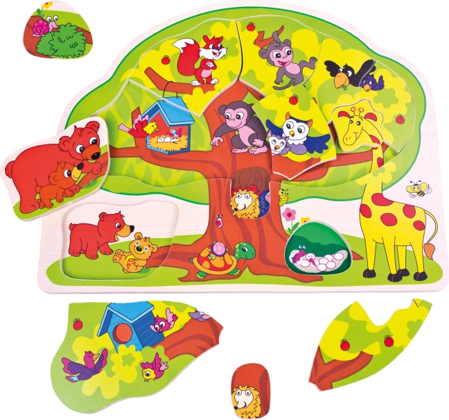 Układanka ma kształt drzewa i zawiera 11 oddzielnych elementów ze zwierzątkami oraz solidną podstawę. Dzięki wytrzymałej sklejce idealnie nadaje się do codziennego użytkowania w domu i w przedszkolu.