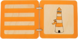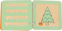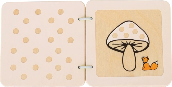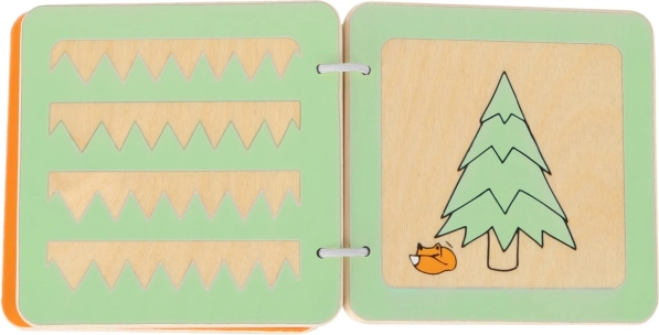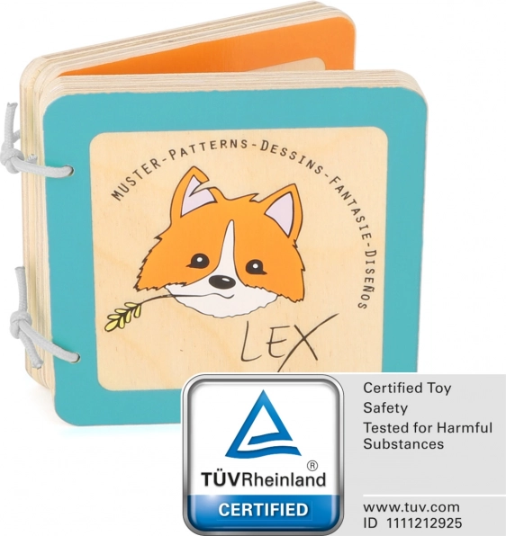 Drewniana książeczka sensoryczna z liskiem Lexem oferuje dzieciom pierwsze spotkanie z prostymi kształtami, wycięciami i ilustracjami, które pobudzają ciekawość i wyobraźnię. Solidne wykonanie, gładkie krawędzie oraz metalowe kółka zapewniają bezpieczne i wygodne przewracanie kartek nawet dla najmniejszych rączek.