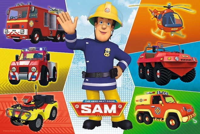 Barwna ilustracja z Samem i jego pojazdami ratunkowymi wciąga dzieci do zabawy i motywuje do ukończenia obrazka.