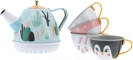 Ten wysokiej jakości metalowy zestaw do herbaty ucieszy wszystkich małych gospodarzy i gospodynie. Wewnątrz dzbanka znajduje się ukryty nakręcany mechanizm muzyczny, który przy przechyleniu rozbrzmiewa przyjemną melodią i zamienia każde serwowanie herbaty w mały ceremoniał. Pastelowe kolory, urocze motywy zwierząt i czyste formy czynią z zestawu piękny prezent oraz stylowy dodatek do dziecięcego pokoju.