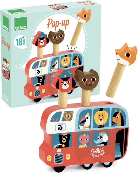 Vilac Drewniana gra wyrzutnia Autobus ze zwierzątkami jest piękną zabawką z ilustracjami znanej artystki Ingeli P. Arrhenius. Trzy urocze postacie – lisek, piesek i kotek – wyskakują z autobusu, co na pewno zapewni dzieciom rozrywkę.