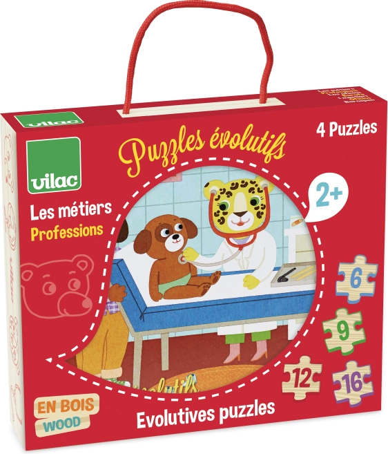 Zestaw zawiera cztery puzzle progresywne z motywami różnych zawodów, zaprojektowane tak, aby motywować dzieci do stopniowej poprawy umiejętności. Dzięki różnej liczbie elementów małe rączki opanują właściwe techniki układania i nauczą się rozpoznawać kształty oraz kolory.