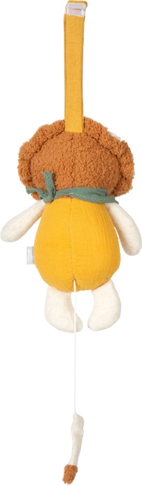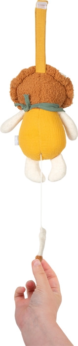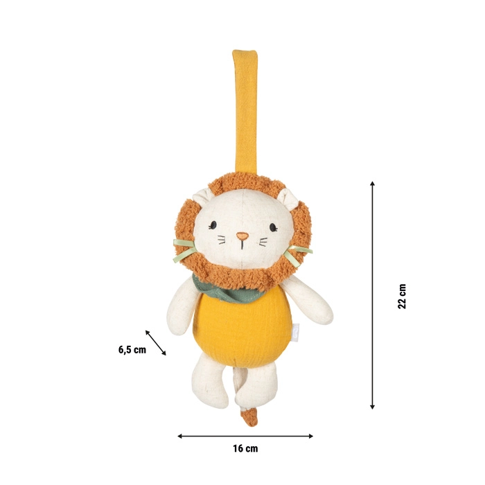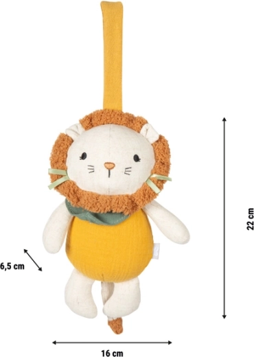 Materiałowy lew łączy delikatne materiały, zabawny design i praktyczne zastosowanie w codziennej rutynie maluszka. Po pociągnięciu za sznureczek rozbrzmiewa przyjemna kołysanka, która pomaga szybciej zasnąć i spokojnie odpocząć. Dzięki kompaktowym wymiarom zmieści się do wózka i przy łóżeczku, zawsze pod ręką.