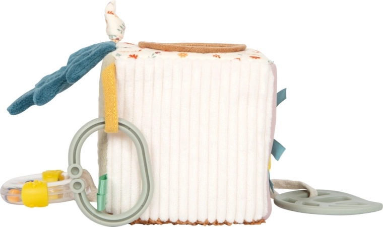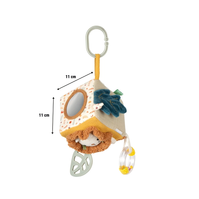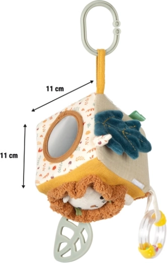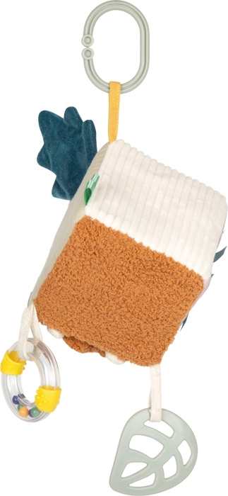 Dzięki miękkiemu wypełnieniu i kompaktowym wymiarom jest idealna dla małych rączek: wspiera chwytanie, ściskanie i obracanie, co naturalnie rozwija małą motorykę. Praktyczna pętla umożliwia łatwe przypięcie do wózka, fotelika samochodowego lub pałąka, więc kostka jest zawsze pod ręką także w podróży.